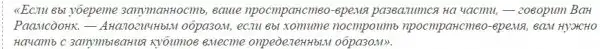 Вдохновленный их работами, а также работой Малдасены, в 2010 году Ван Раамсдонк предложил мысленный эксперимент, демонстрирующий критическую роль запутанности в формировании пространства-времени, размышляя над тем, что может произойти, если разрезать чип памяти на два и затем удалить запутанности между кубитами в противоположных половинах. Он обнаружил, что пространство-время начнет рвать себя на части, подобно тому, как растягивание жевательной резинки в разные концы образует рваные дыры в центре. Продолжая разделять этот чип памяти на меньшие и меньше части, можно разорвать пространство-время, пока не останутся только крошечные индивидуальные фрагменты, не связанные друг с другом.