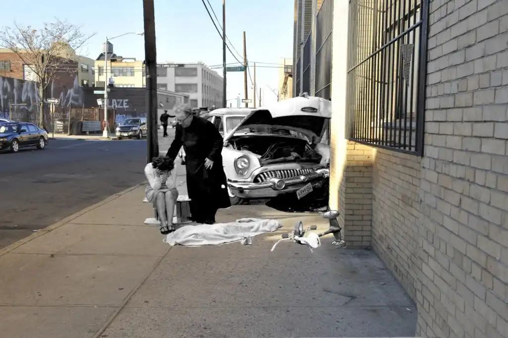 Porter ave. and Harrison pl. 3-х летняя Марта Картагена была сбита машиной, когда каталась на трехколесном велосипеде напротив своего дома. На фото пастор утешает ее старшую сестру. На кирпичной облицовке здания до сих пор остались сколы и царапины оставшиеся от того трагического происшествия.