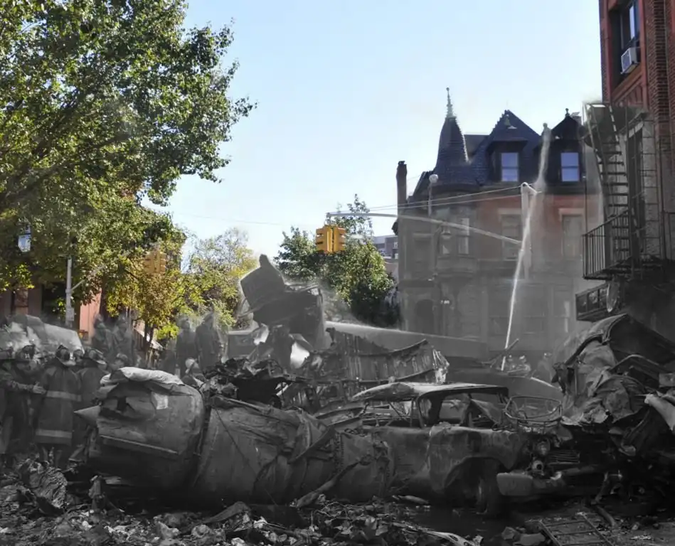 7th ave. and Sterleng pl. Это фото сделано на следующий день после самой страшной гражданской авиакатастрофы в США на то время, когда в небе над Нью-Йорком столкнулись самолеты United Airlines, рейс 826, и Trans World Airlines, рейс 266. В катастрофе погибли все 128 пассажиров обоих рейсов и 6 человек на земле. Обломки самолетов упали на здания Парк-Слоуп, что вызвало пожар и разрушения 10 зданий, включая церковь Огненного столпа, похоронное бюро и магазин деликатесов. Единственным выжившим в катастрофе был 1-летний мальчик Стивен Ламберт Балц, которого взрывом выбросил в сугроб, где его сразу потушили оказавшиеся рядом жители. Но на следующих день мальчик умер от пневмонии. Статья о катастрофе на Википедии.