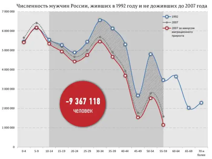 По женщинам цифры потерь скромнее - "всего" 3,5 млн. женщин не пережило ваших 90-х. Максимальные потери понесли женщины от 30 до 59 лет. Таким образом мы имеем около 13 млн. за 15 лет умерших гораздо раньше своего пенсионного возраста до 2007 года. Часть из них безусловно умерла бы своей смертью, но отнюдь не в таких масштабах, как вышло в реальности.