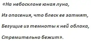 “Особенно хороша была Томоэ — белолица, с длинными волосами, писаная красавица! Была она искусным стрелком из лука, славной воительницей, одна равна тысяче! Верхом ли, в пешем ли строю — с оружием в руках не страшилась она ни демонов, ни богов, отважно скакала на самом резвом коне, спускалась в любую пропасть, а когда начиналась битва, надевала тяжелый боевой панцирь, опоясывалась мечом, брала в руки мощный лук и вступала в бой в числе первых, как самый храбрый, доблестный воин! Не раз гремела слава о ее подвигах, никто не мог сравниться с нею в отваге.”