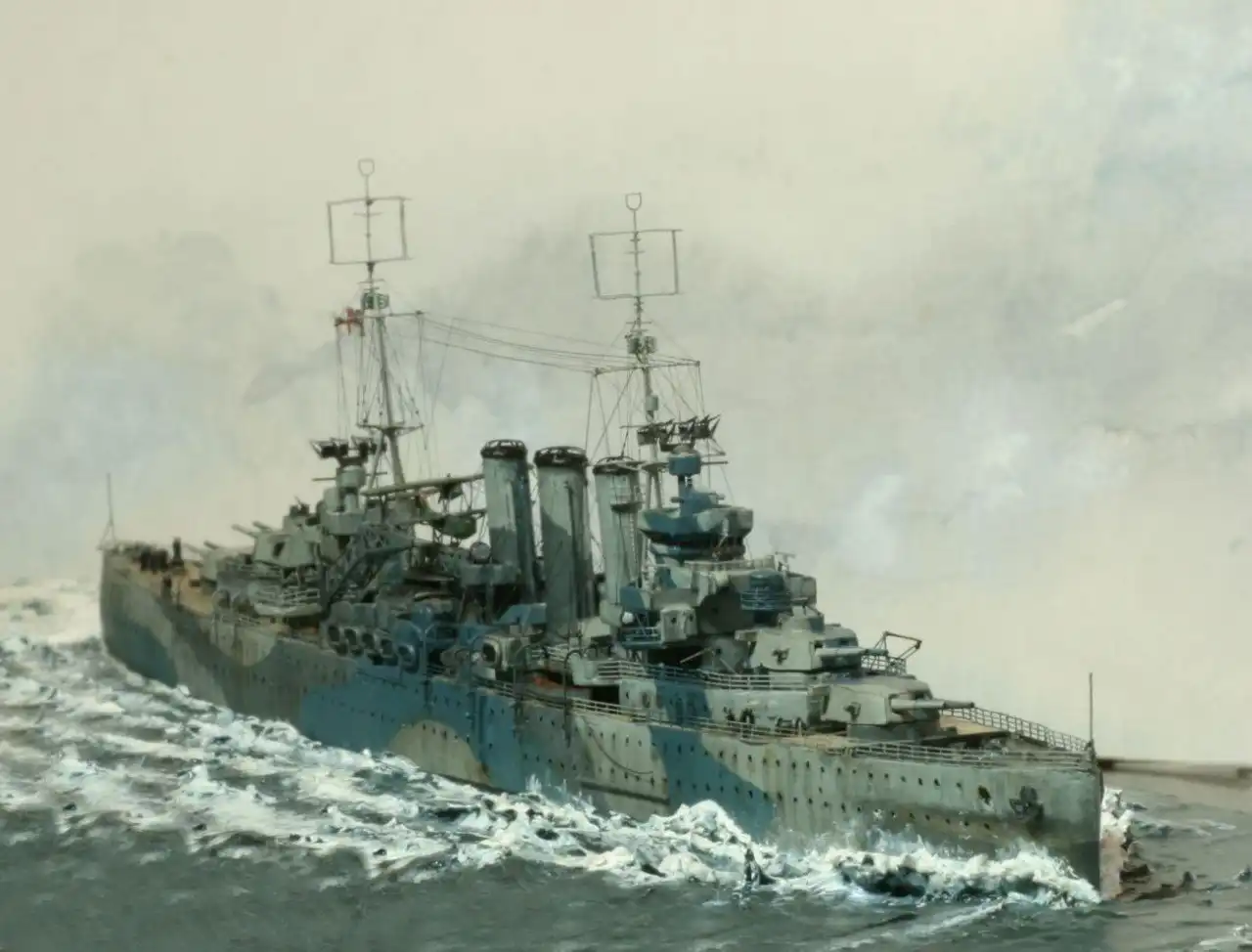Impression of a Ki-51 «Sonia» kamikaze on the hull of the HMS Sussex. The Sonia (reported as a Val, as often happened), is said to have hit the water before hitting the hull, probably losing its bomb in the process. / Отпечаток Ki-51 «Sonia» камикадзе на корпусе тяжелого торпедного катера Sussex. «Соня» ударилась об воду перед столкновением с корпусом, возможно потеряв при этом свою бомбу.
