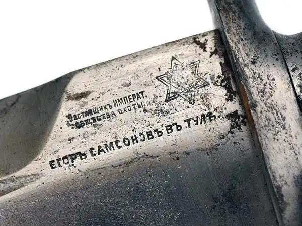 После того, как Самсонов на выставке 1898 г, получил звание почетного члена Императорского общества правильной охоты, но пяте клинка стали наносить знак общества в форме шестилучевой звезды и надпись — «Поставщикь ИМПЕРАТ. Общества охоты».