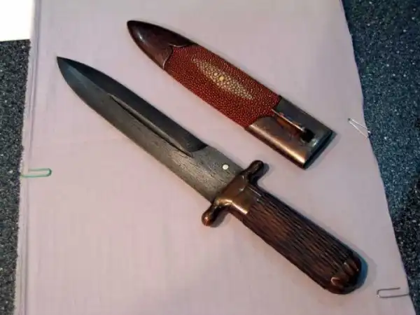 Очевидно, что это нож типа «боуи» шеффилдского производства. В России были популярны изделия фабрики «Роджерс» — крупнейшего производителя ножей в Шеффилде.