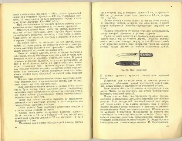 В 1894 г. в журнале «Природа и охота» он опубликовал статью «По поводу вновь изобретенной механической рогатины», в которой подробно описал историю создания медвежьего» ножа: «Самым удобным ножом я считаю нож американской системы с небольшими, сделанными лично мною, изменениями в форме. Этот нож имеет обоюдоострый клинок, который заострен к концу. С выямками по бокам, шесть вершков длины (26,7 см), один вершок ширины (4,45 см) и восемь миллиметров толщины. Лезвие ножа отделяется от рукояти стальной перекладиной, рукоятка изготовлена из крепкопородного дерева держится но клинке широким винтом. Носится этот нож на черном поясном ремне в деревянных, обтянутых черной кожей ножнах, концы которых обделаны вороненой сталью. Размеры ножа и его баланс рассчитан так, что он удобно держится в руке и им отлично можно рубить, резать, колоть и вспарывать брюхо натиском кверху или книзу. Первый такой нож отлично изготовил мне тульский мастер Егор Самсонов, а затем такие ножи стали делать на Златоустовском казенном заводе».
