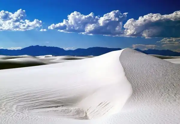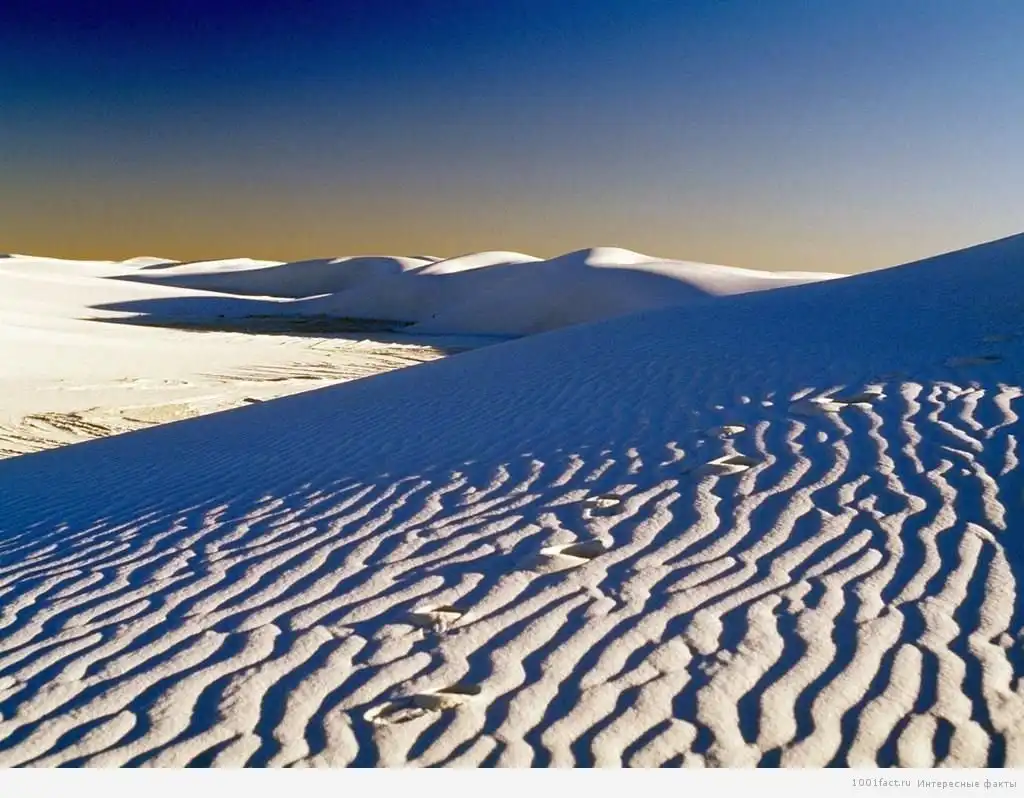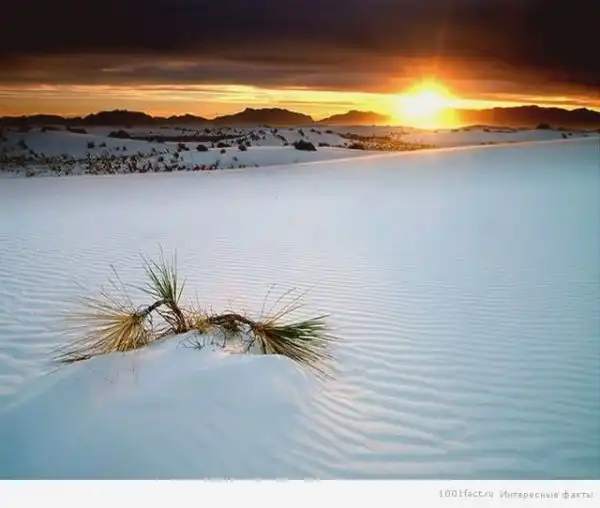 На юге Соединенных Штатов Америки, в штате Нью-Мексико есть уникальная пустыня – Пустыня Белых Песков, которая расположена в одноименном заповеднике. Уникальность этого места заключается в том, что, не смотря на то, что это самая настоящая пустыня, песок здесь не привычного желтого цвета, он белоснежный.