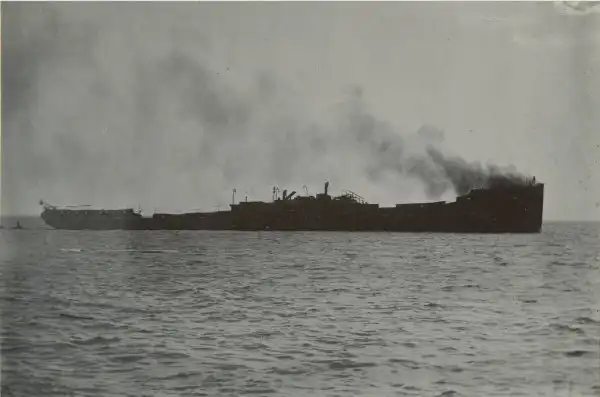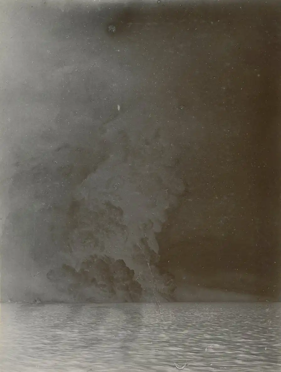 «… Стюард промчался (позже он погиб) мимо каюты, где я помогала детям одеться к завтраку, и крикнул: «Закройте дверь каюты — приближается вулкан!» Мы закрыли дверь, и в тот же момент раздался ужасный взрыв, от которого чуть не лопнули барабанные перепонки. Судно поднялось высоко в воздух, а потом, казалось, все тонет, тонет. Удар сбил нас с ног, и мы сжались в одном углу каюты.