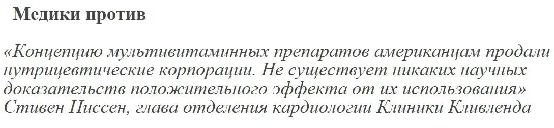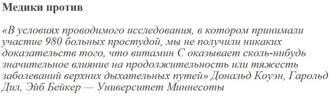 Сложность позиции научного сообщества объяснялась тем, что опровергать недоказанную версию часто бывает даже затруднительнее, чем доказывать ее. А аргументация «С чего ты это вообще взял, идиот?» в случае с Полингом не работала: уж больно мощная у парня была изначальная репутация. Ну вот, случилось гениальное озарение, а вы уж расхлебывайте. Расхлебывание длится до сих пор, но на данный момент уже можно с уверенностью сказать: «Полинг, ты неправ». Многочисленные и многолетние наблюдения не обнаружили взаимосвязи между приемом БАДов и состоянием здоровья пациентов. Медики против «Не существует научных доказательств полезности дополнительного использования витаминов.