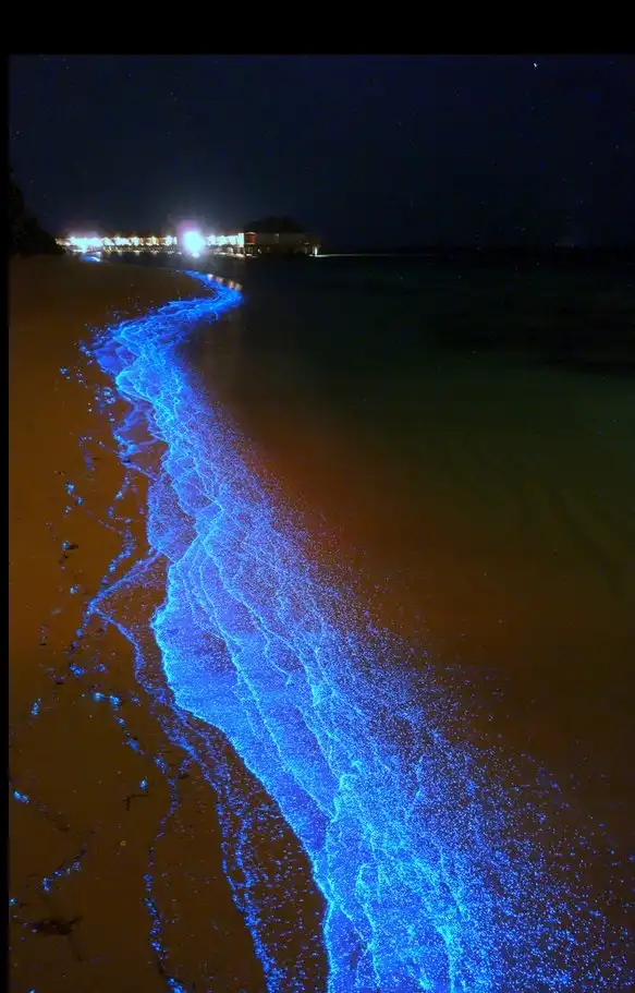 Мальдивы прекрасны сами по себе. Жаркое солнце, ласковое море и бескрайняя береговая линия. Но есть еще одна достопримечательность Мальдив — биолюминесцентный фитопланктон. Уникальные водоросли известны также под названием «красный прилив». Местные жители утверждают, что купание в подобных водах вызывает небольшой дискомфорт, поэтому такая береговая линия чаще всего является безлюдной. С наступлением темноты биолюминесцентный фитопланктон начинает светиться, освещая побережье фантастическим голубым светом. Тайваньский фотограф Will Ho запечатлел это явление.