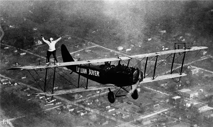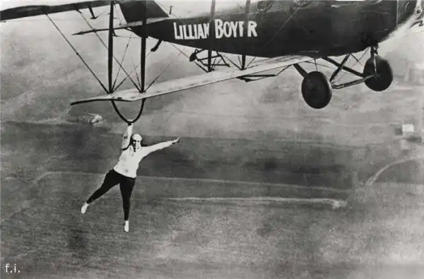 1922 год. Известный вингволкер Лилиан Бойер под крылом биплана.