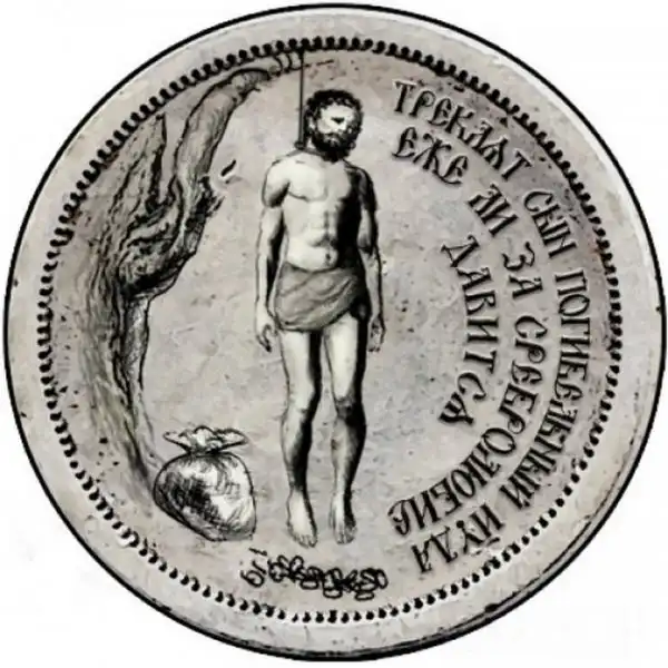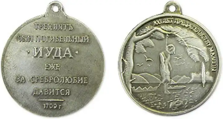 После этого и приказал Петр отлить орден. На изготовление его пошло пять килограмм серебра. На аверсе изобразили Иуду Искариота, повесившегося на осине, внизу — 30 сребреников и надпись «Треклят сын погибельный Иуда еже ли за сребролюбие давится».