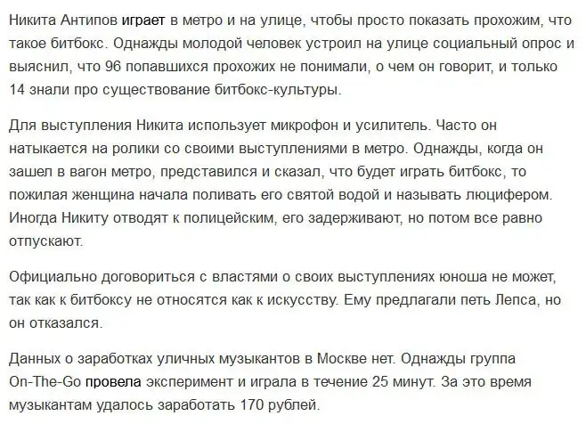 Уличных музыкантов можно встретить практически в каждом более-менее крупном городе, однако, сколько зарабатывают эти люди, никто точно сказать не может. Чтобы пролить свет на этот интересный вопрос необходимо поговорить с самими музыкантами, играющими на улицах таких городов, как Нью-Йорк, Москва и прочих.