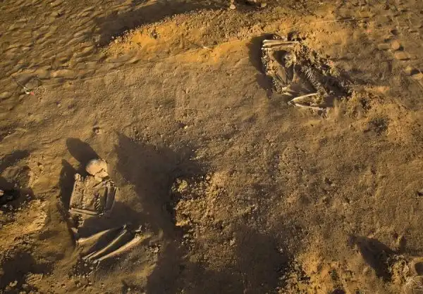 Два прекрасно сохранившихся скелета были найдены в начале раскопок. У скелета слева средний палец был во рту. Правый был похоронен в могиле: