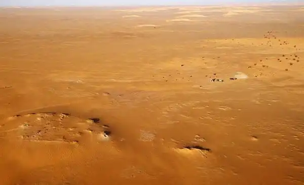 Вид с воздуха на пустыню и еле различимые палатки небольшой группы археологов, ведущих раскопки. Глядя на эту фотографию трудно поверить, что несколько тысяч лет назад это была «зеленая» Сахара:
