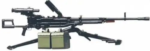 Крупнокалиберный пулемет НСВ-12.7 (кодовое обозначение в ходе разработки "Утес") был разработан в период 1969 - 1972 годов конструкторами Никитиным, Соколовым и Волковым для замены устаревшего крупнокалиберного пулемета ДШКМ. При разработке изначально закладывалась универсальность нового пулемета - он мог использоваться как оружие поддержки пехоты с легкого пехотного станка-треноги, как зенитный пулемет со специальных установок, а также для вооружения бронетехники и малых судов. Пулемет был принят на вооружение в 1972 году и массово выпускался в СССР, кроме того, его копии выпускались в Югославии и Болгарии. После развала СССР основной производитель пулеметов НСВ, завод "Металлист", оказался в независимом Казахстане, и в России для замены этого пулемета был разработан крупнокалиберный пулемет "Корд". Вариант НСВ также производится в независимой Украине.Крупнокалиберный пулемет НСВ-12.7 использует газоотводную автоматику, газовый поршень с длинным ходом расположен под стволом. Ствол быстросменный. воздушного охлаждения. Запирание ствола производится путем смещения всего затвора вбок (влево), так что боевые упоры затвора входят в зацепление с пазами во вкладыше ствольной коробки. Затвор соединен с затворной рамой качающимися серьгами, затворная группа имеет несколько роликов, снижающих трение при ее движении в откате и накате. Стрельба ведется с открытого затвора. Питание патронами - из нерассыпной металлической ленты с открытым (незамкнутым) звеном. Лента собирается из кусков по 10 звеньев при помощи патрона. Подача патронов из ленты - напрямую в ствол. Штатное направление движения ленты - справа налево, однако оно может быть легко изменено на обратное.Из органов управления на теле пулемета имеются только спусковой рычаг и ручной предохранитель. Органы управления огнем располагаются на станке либо установке. В пехотном варианте они включают закрепленные на люльке станка 6Т7 пистолетную рукоятку со спусковым крючком и механизм взведения затвора. Дополнительно пехотный станок оснащается складным прикладом со встроенным пружинным буфером отдачи. На зенитном станке 6У6 спуск выведен на педаль (руки стрелка заняты механизмами наведения), в танковом варианте пулемет может оснащаться электрическим дистанционным спусковым механизмом. В пехотном варианте пулемет НСВ оснащается открытым прицелом, а также оптическим прицелом СПП с переменной кратностью 3-6Х или ночным прицелом. В зенитном и танковом варианте специальные прицелы крепятся к установке.