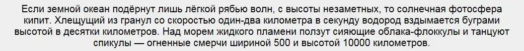 Материя солнечной мантии представляет собой столь же экзотическую субстанцию, как и «чёрный водород» недр. Её можно назвать «жидким пламенем» — причём термин окажется удивительно точным. Ведь пламя — струи раскалённого, ионизированного газа. В недрах Солнца он просто сжат до состояния жидкости — в глубинах плотной и вязкой, как ртуть, выше же подобной расплавленному камню.