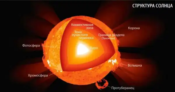 Твёрдая сердцевина занимает половину объёма Солнца и условно делится на две не имеющие чёткого разграничения зоны: ядро, имеющее радиус 20-25% солнечного (только в этой зоне давление достаточно для протекания термоядерных реакций), и зону лучистого переноса. Через последнюю родившиеся в ядре фотоны медленно и мучительно протискиваются к границе конвективной зоны — аналогу мантии планет.