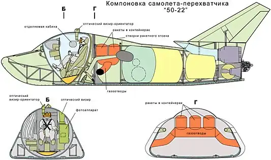 - дальний перехватчик, оснащенный самонаводящимися ракетами разработки СКБ МОП с оптическим координатором для перехвата космических целей на пересекающихся курсах при промахе перехватчика до 40 км, компенсируемым ракетой. Максимальная дальность пуска ракеты составляет 350 км. Вес ракеты с контейнером 170 кг. Поиск и обнаружение заранее заданной цели, а также наведение ракеты на цель производится летчиком вручную с помощью оптического визира. Энергетика этого варианта перехватчика также обеспечивает перехват 2-х целей, находящихся на высотах до 1000 км.
