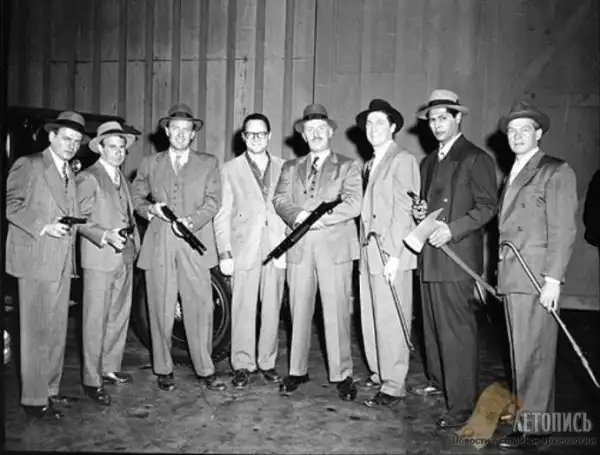 • длинный плащ, под которым угадывается автомат Томми или пара кольтов;
