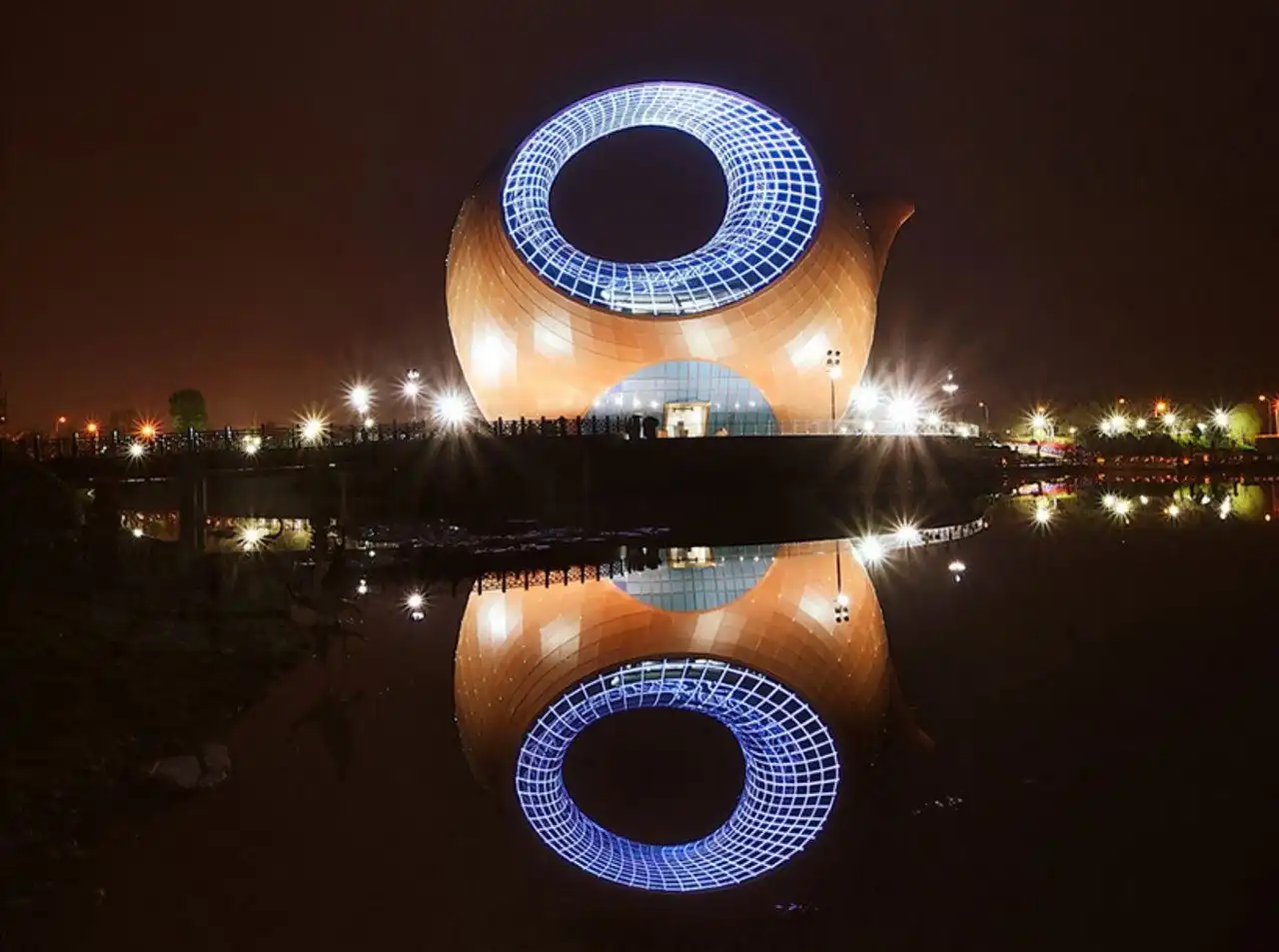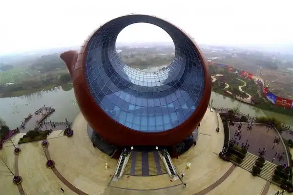 В Китае заканчилось строительство культурно-выставочного центра, имеющего оригинальную архитектурную форму, выполненную в виде глиняного чайника. Это здание уже официально попало в Книгу рекордов Гиннеса, как самый высокий чайник в мире.
