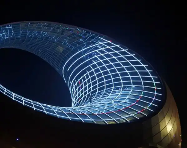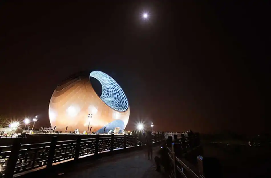 Фирма-застройщик The Wanda Group объявила, что на строительство культурно-выставочного центра было потрачено 40 млрд. юаней (6,4 млрд. долларов). В итоге получилась конструкция площадью 3,4 миллиона кв. метров. Ее высота составляет 38,8 метра, а диаметр 50 метров. Снаружи здание обшито алюминиевыми листами, которые обеспечивают необходимую кривизну каркаса. Помимо них немаловажную роль играют стеклянные витражи разного размера.