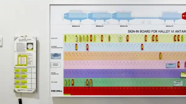 Доска наблюдения за текущим местонахождением персонала. Все работники научно-исследовательской станции должны быть на виду из соображений безопасности.