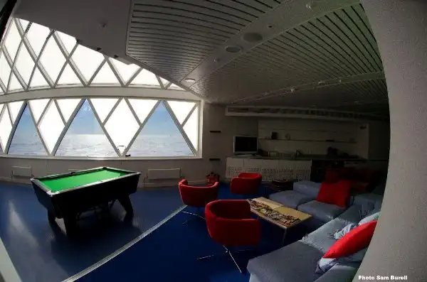 Ярко-красный модуль британской исследовательской станции Halley VI, в котором находится столовая, спортзал, бильярдная, комната для просмотра телевизора и бар.