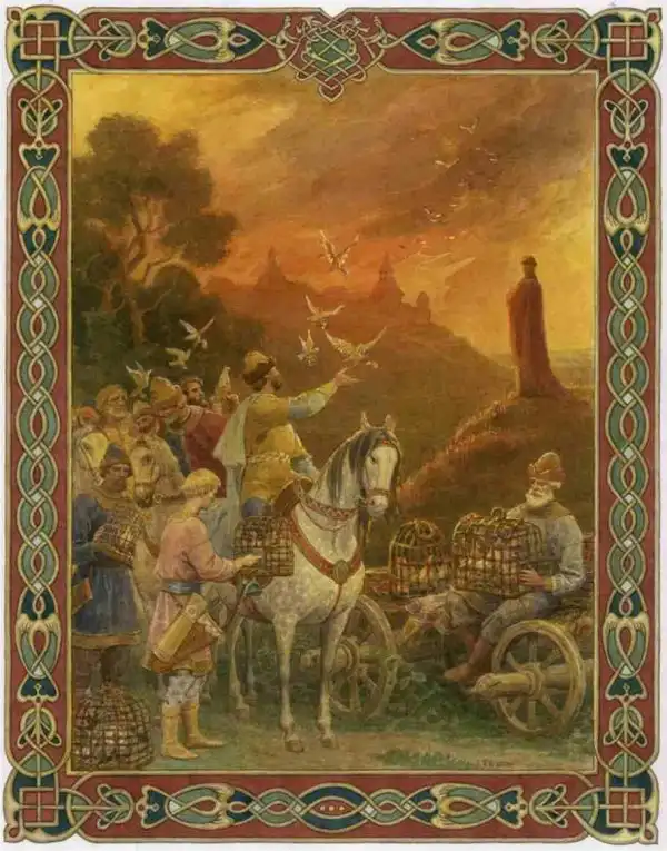 Осадив древлянский Искоростень, хитрая Ольга не стала мстить за убийство мужа, и предложила обидчикам ничтожную дань, «от каждого двора по три голубя да по три воробья». Древляне обрадовались такой милости, не распознав военной хитрости: согласно легендарному описанию Нестора, воинство Ольги и Святослава привязало к птицам труты, пламя объяло город, после чего он был полностью разорен.