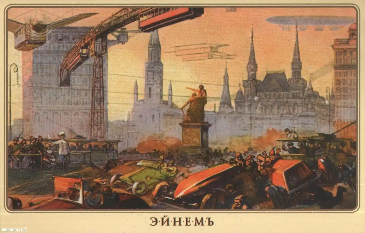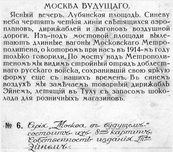 В далеком 1914 году «Товарищество Эйнемъ» выпустила серию шоколадных конфет под названием «Москва будущего». В каждую коробку с конфетами упаковывалась и серия из 8 рекламных открыток такой же тематики. К каждой открытке прилагалось соответствующее описание, в полной мере раскрывавшее представления и ожидания наших предков.