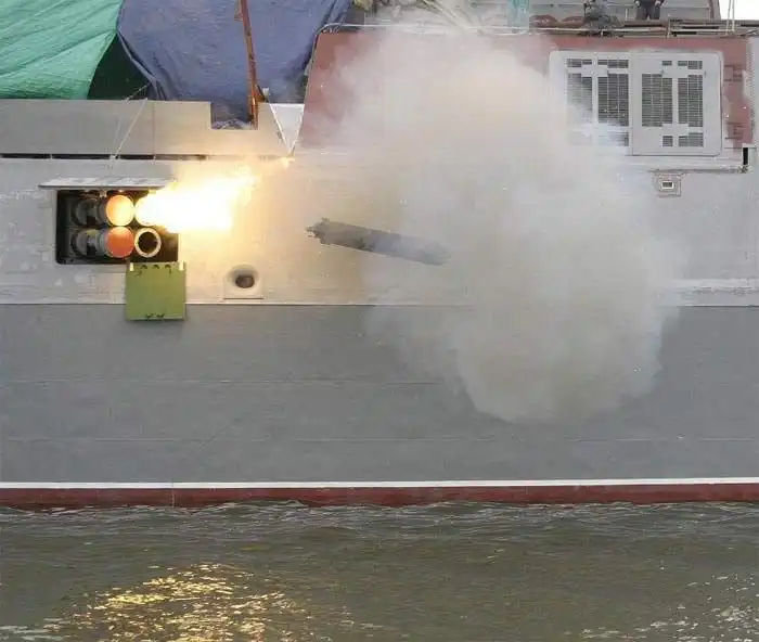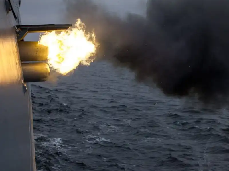 Корвет «Сообразительный» выстреливает боеприпас комплекса
