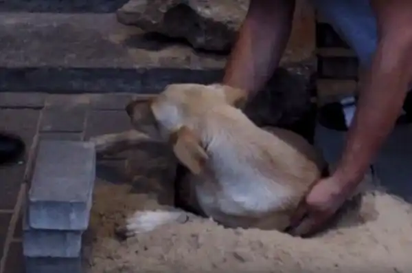 Вадим осторожно вытаскивает собачку из ямы, замечая, что животное выглядит слишком “сытым” для того, кто провел несколько дней под землей без еды. Собака беременна! До сих пор никто так и не может объяснить, как этот четвероногий друг оказался под землей. Закопали ли его туда нарочно? Или просто не заметили?