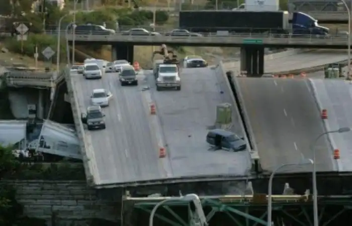 Из-за устаревшей конструкции часть моста автострады разрушилась в час пик, в результате чего несколько машин съехали в реку Миссисипи. 13 человек погибло, еще 145 получили ранения.