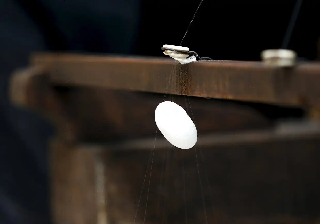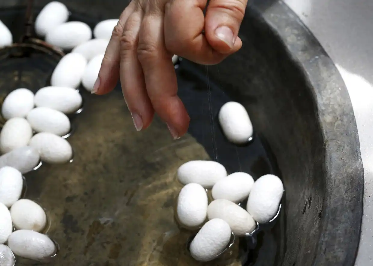 Коконы нужно успеть собрать до того, как появятся бабочки. Если их передержать, то бабочка прогрызет кокон и повредит шелк. Коконы погружают в кипящую воду, чтобы убить гусениц и растворить защитный слой.