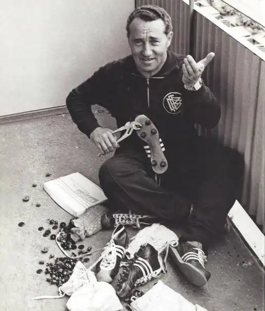 Адольф Дасслер прикручивает шипы к бутсам Adidas, 1954 год