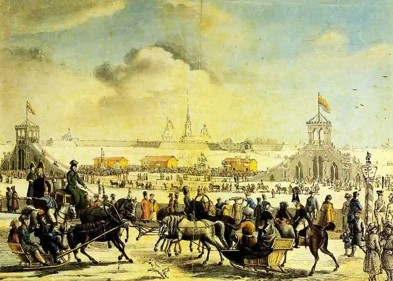 А о размахе гуляний и популярности ледяных гор в ту пору можно судить по сообщению газеты «Северная пчела», которая сообщает о 7000 человек, скатившихся с горы в течение дня.