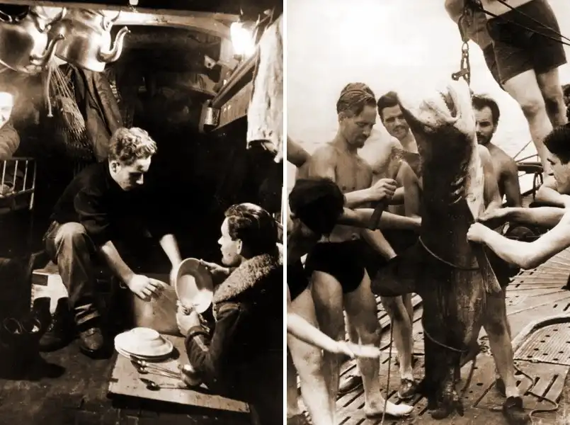 На фото разделка акулы на палубе немецкой подлодки (справа)