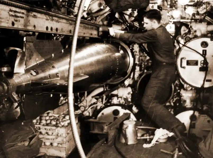 Ящики с фруктами в носовом отсеке лодки U 295 соседствуют с торпедами.