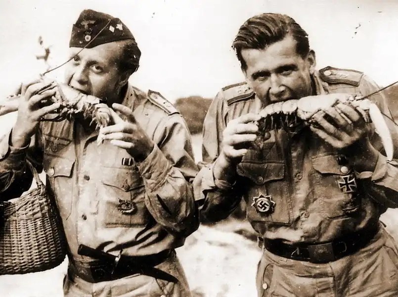 два члена экипажа подводной лодки U 672 позируют с омарами
