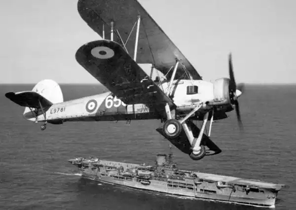 Торпедоносец «Суордфиш I» из 820-й эскадрильи пролетает