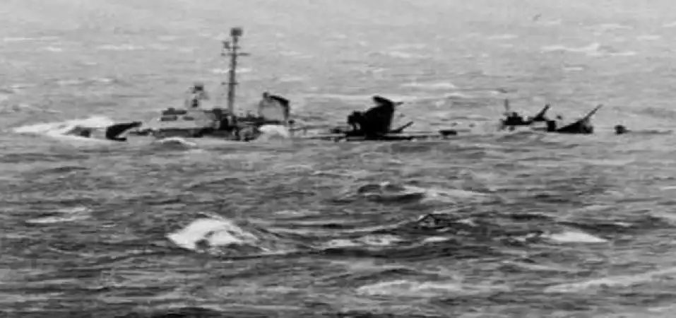 Под их ударами эсминец наклонило чуть ли не до уровня моря. Топлива в цистернах почти не оставалось, и корабль не успевал быстро выравниваться. В итоге он перевернулся и затонул, унеся с собой 341 члена экипажа. Спаслись лишь 24 моряка.