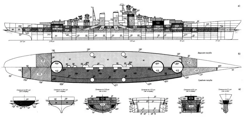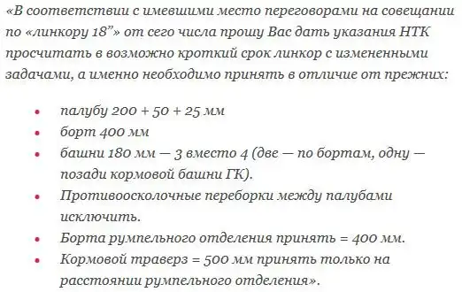 Напомним, что проект 24, существовавший пока только в предэскизном варианте, имел более слабое бронирование — 375-мм борт и 155-мм главную броневую палубу, а средним калибром нес только 130-мм универсальную артиллерию. При этом комиссия Ставицкого рекомендовала ограничить водоизмещение будущего линкора 75 000 тоннами. «18-дюймовый линкор» явно выходил за рамки этих ограничений.