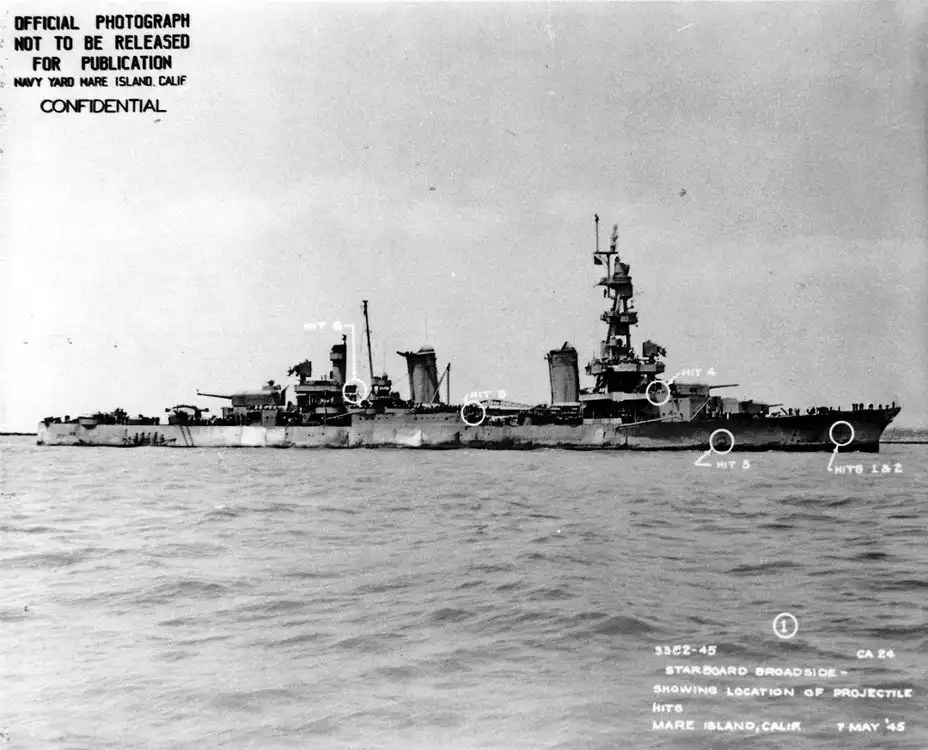 Считается, что 16 февраля 1945 года лейтенанту Дугласу У. Ганди, пилотировавшему OS2U Kingfisher, взлетевший с борта крейсера, удалось сбить японский истребитель. В ходе обстрела Иводзимы 17 февраля в крейсер попали шесть снарядов с японских береговых батарей, что привело к гибели 17 (в том числе, 3 офицеров) и ранению 119 (в том числе, 5 офицеров) членов экипажа.