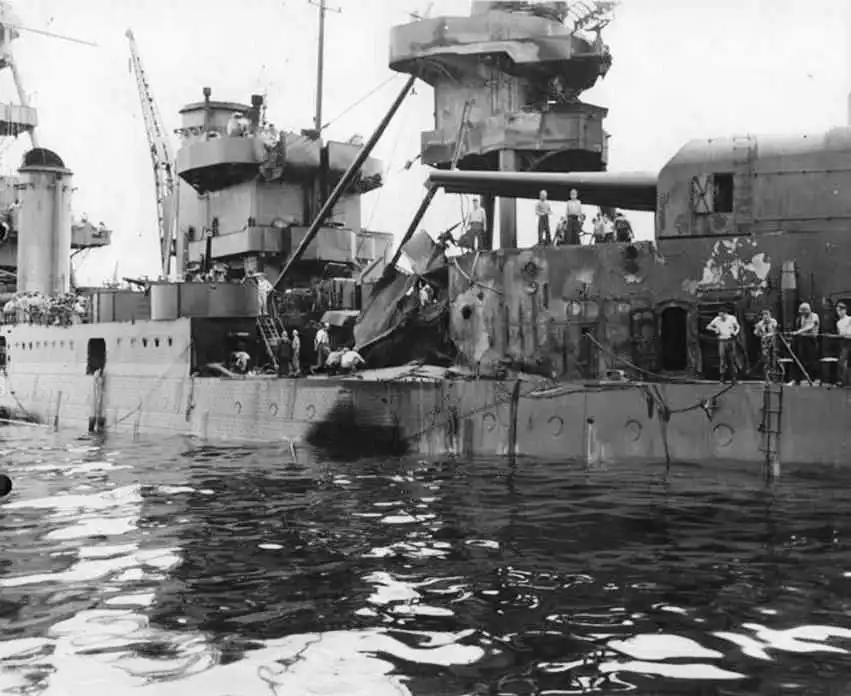 Крейсер Pensacola после попадания торпеды 30 ноября 1942 года.