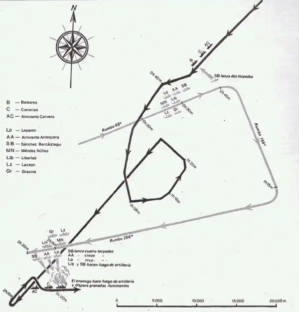 В 2:17 с «Санчеса» выпускают залпом четыре торпеды, в 2:18 – пять торпед с «Антекьеры», в 2:19 – ещё три с «Лепанто». Таким образом, в общей сложности республиканцы выпустили двенадцать торпед. Столь массовый торпедный залп с короткой дистанции поставил точку в скоротечном ночном бою. Приблизительно в 2:20 в «Балеарес» попали две или три торпеды – предположительно, с эсминца «Лепанто».