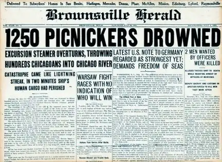 В роковой день 24 июля 1915 года работники компании «Вестерн Электрик» со своими семьями отплывали на озеро на ежегодный пикник. 2 573 пассажира и члена экипажа в праздничном настроении заполнили «Истлэнд» у его причала на реке Чикаго. Играли оркестры, друзья и знакомые здоровались друг с другом. Никто, кажется, и не встревожился, когда корабль начал крениться на левый борт. В некоторых сообщениях указывалось, что толпа собралась на одном борту, чтобы попозировать для фотоснимка. В 7.28 пополудни «Истлэнд» накренился на 45 градусов. Механик отчаянно пытался удержать судно, открыв одну из балластных цистерн. Но было уже поздно. «Истлэнд» перевернулся, когда он стоял на якоре всего в шести метрах от пристани, на глубине всего в шесть метров, заперев сотни мужчин, женщин и детей под внутренностями судна. Это случилось так внезапно, что применить спасательное снаряжение просто не успели.