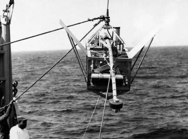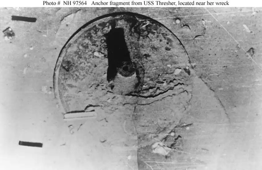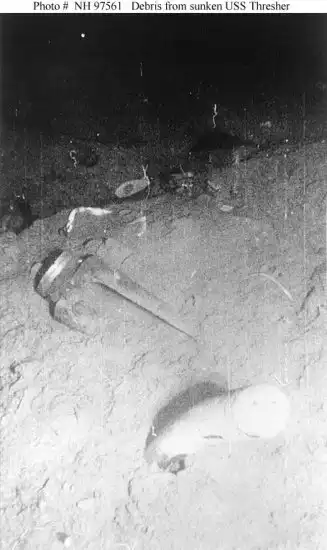 ...Останки «Трэшера» были обнаружены 27 июня 1963 года. Сначала с помощью подводной фотосъемки на дне отыскались обломки, похожие на части металлических перил, обрывки материи и бумаг, а также баллон со сжатым воздухом, зарывшийся в илистое дно.