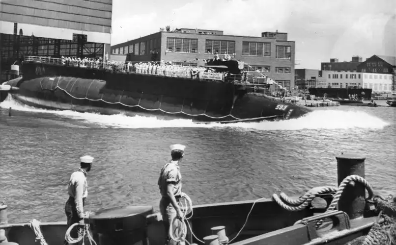 В пятницу, 12 апреля, на верфи в Портсмуте приспустили флаг. Верфь на несколько минут замерла. Матросы и солдаты стоят «смирно», рабочие снимают защитные каски... Случай с «Трэшером» — не только крупнейшая катастрофа ВМС США в мирное время, но и вообще ужасающая по числу жертв трагедия.