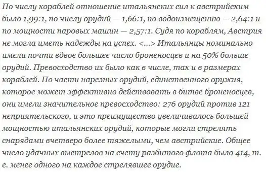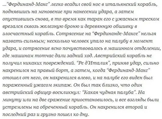 Добавим, что переход адмирала на самый быстроходный броненосец в эскадре по итогам боя выглядел крайне неприглядно — хотя есть мнение, что изначально логика была другая: Персано сам рассчитывал применить таран. Но вышло так, что «Аффондаторе», специализированный броненосец-таран, так никого и не протаранил. В отличие от австрийцев, которые яростно бодались с риском для собственной жизни — конструкция их кораблей была недостаточно прочной для такого балета.