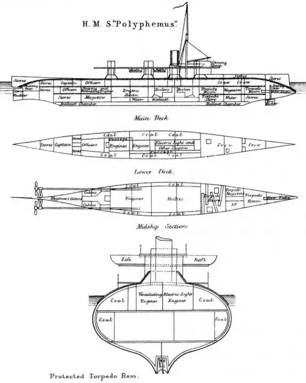 «А как же таран?! — воскликнули в Адмиралтействе — Без тарана нельзя! Причём внутри него можно поставить ещё один торпедный аппарат!». Главный инженер флота Натаниэль Барнаби пожал плечами и заказ выполнил, изменив исходный проект — «Полифем» оснастили таранным форштевнем длиной чуть больше четырёх метров, на оконечье которого имелась крышка торпедного аппарата. Схема применения? Да очень просто! Торпедный миноносец браво врывается в гавань противника, выпускает боезапас из восемнадцати торпед, если не попал — таранит цель! Артиллерийское вооружение? Ох уж эти замшелые традиции! Но надо отдать дань тёмному прошлому, давайте всё-таки установим шесть 25-миллиметровых двухствольных пушек системы Норденфельда!