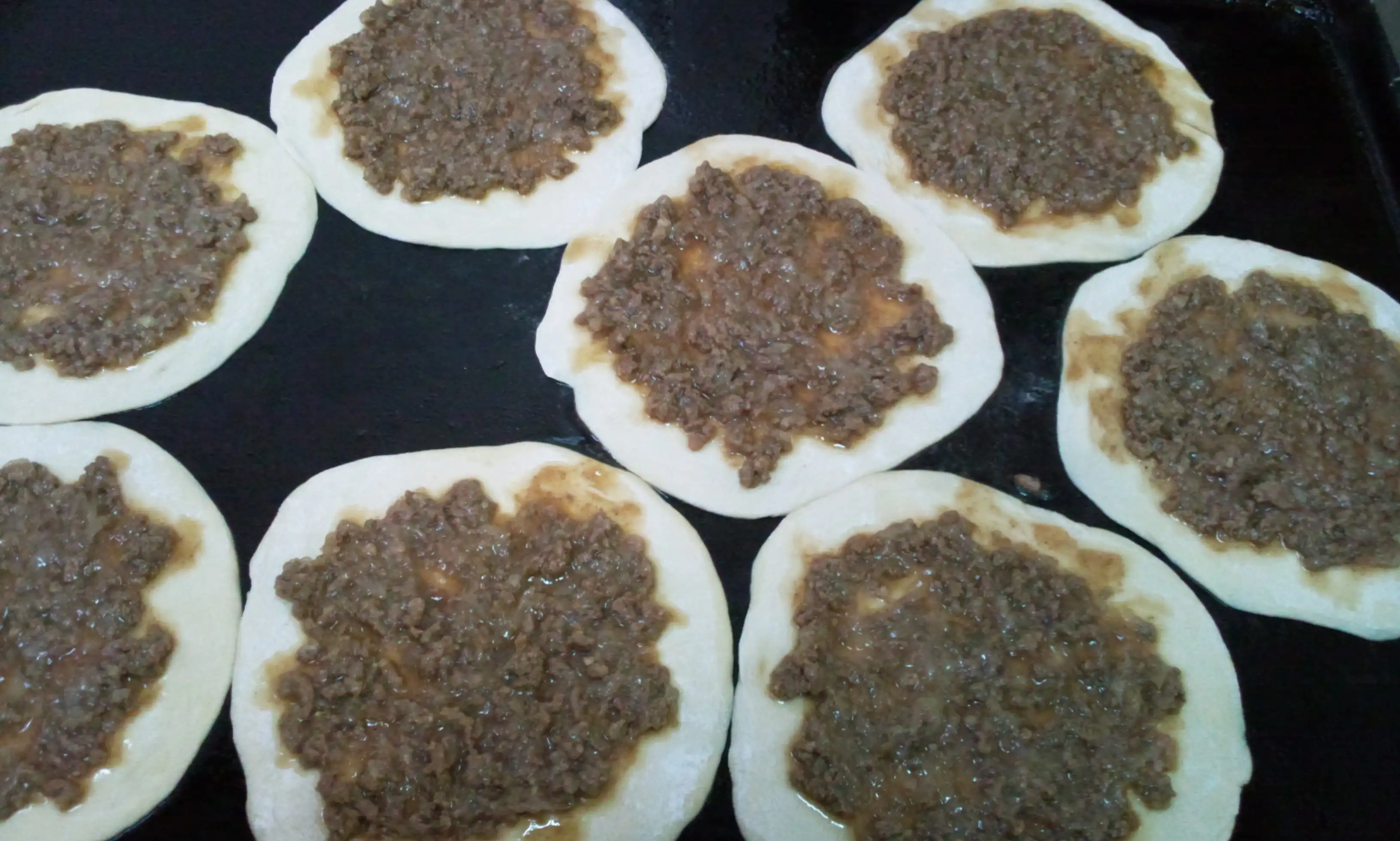 Основу из дрожжевого теста густо мажем соусом. Выкладываем фарш.